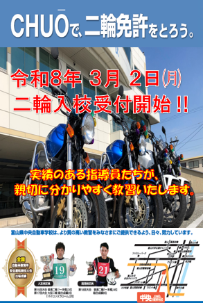 令和8年3月2日㈪より、自動二輪免許の入校受付を開始いたします。